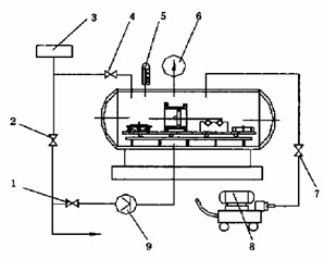1、 实验压力罐 2、排气阀 3、截止阀 4、压力表 5、衬胶蝶阀 6、伸缩接头 7、电磁换向阀 8、水源 9、水泵