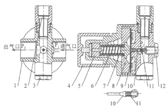 当进气口压力P1 达到设定最大值时, 垫片和 复位小弹簧左移到最大值, 小锥形阀瓣将出气口完 全堵塞,即节流孔通流面积为零,气体只能从旁边的阻尼孔出去, 此时P2 为0 。通过调节微调旋钮可以 调节大小弹簧的预紧力, 从而可以调节工作压力的 范围。