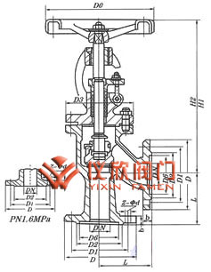 三、J44H-Y角式截止阀 1.6MPa主要连接尺寸